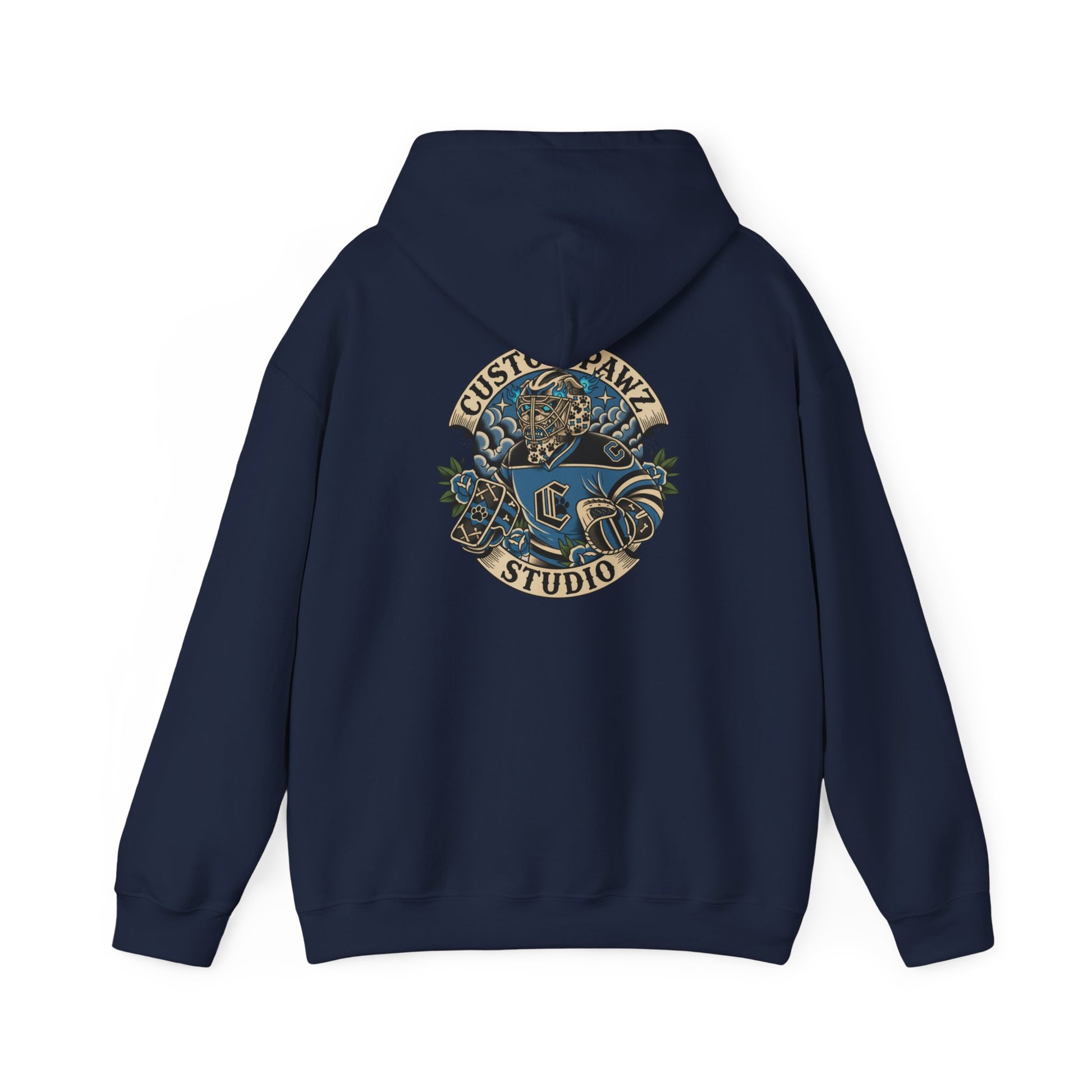 This cozy hooded sweatshirt brings a laid-back studio vibe to chilly days. Lightweight enough for layering, it features a small, embroidered emblem at the left chest and a bold, artful crest across the back—both rendered in muted blues and warm neutrals for a vintage, hand-crafted look. The roomy kangaroo pocket and double-lined hood keep your hands and head warm, while the soft 50/50 cotton-poly blend holds prints and embroidery crisply. Wear it on slow mornings in the shop, while sketching by a window, or on evening drives when you want something that feels familiar and worn-in without losing its structure.