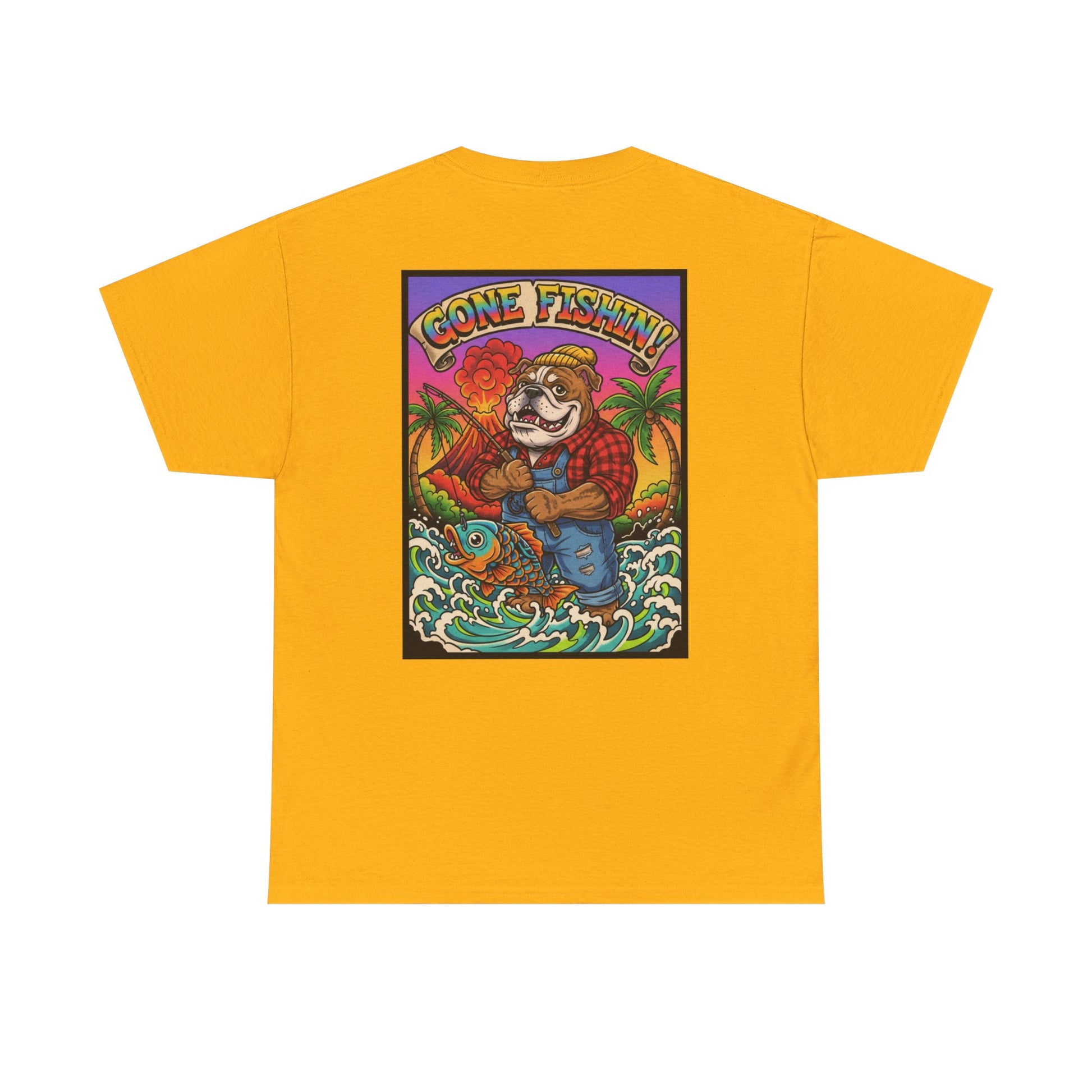 This tee brings sunlit afternoons and salt-sprayed laughter straight into your everyday rotation. A warm gold base carries a small, worn-in paw print over the heart and an energetic, retro-style “Gone Fishin’” scene on the back — a grinning angler, crashing waves, and tropical palms rendered in vibrant, slightly faded hues. It feels like the easy confidence of a long weekend: salt on your skin, a cooler in the back, and a story ready to be told. Wear it to the boat ramp, the pier, or to backyard hangs when you want a laid-back, nostalgic vibe that still reads playful and deliberate. The classic crew neck and relaxed cut let it layer under a shacket or stand alone with cutoffs and canvas sneakers.